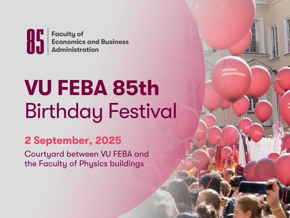 This year, the Faculty of Economics and Business Administration at Vilnius University (VU FEBA) proudly celebrates its 85th anniversary. On September 2, we warmly invite our community, alumni, and friends to gather at a special birthday festival, held in the cozy courtyard between VU FEBA and the Faculty of Physics.