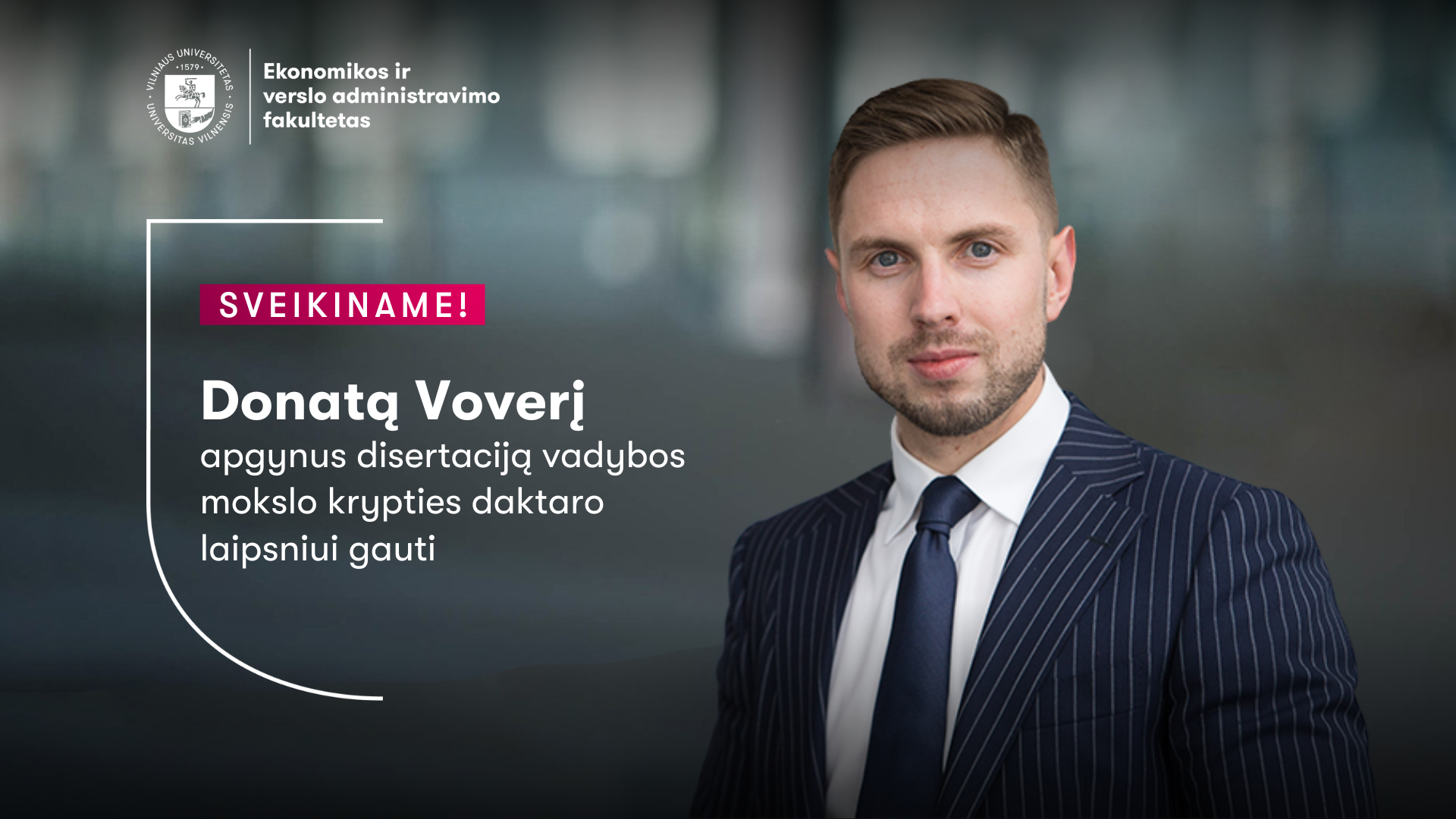 Vilniaus universiteto Ekonomikos ir verslo administravimo fakulteto bendruomenė didžiuojasi savo nariu – rugsėjo 4 d. sėkmingai apgynusiu daktaro disertaciją „Vadovo tipo ir individualių savybių poveikis įmonės strateginei orientacijai ir finansiniams rezultatams“.