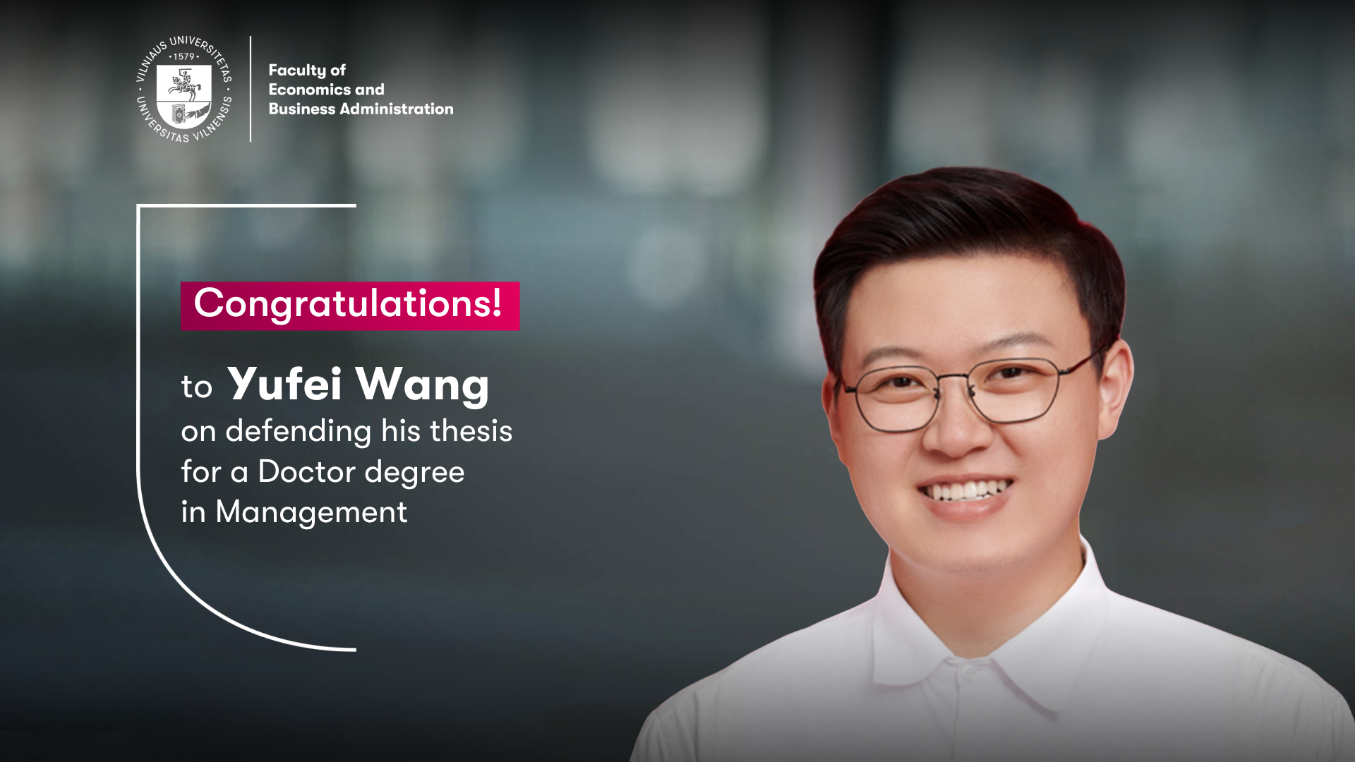 Nuoširdžiai sveikiname dr. Yufei Wang sėkmingai apgynus daktaro disertaciją vadybos mokslo kryptyje Vilniaus universiteto Ekonomikos ir verslo administravimo fakultete (VU EVAF).