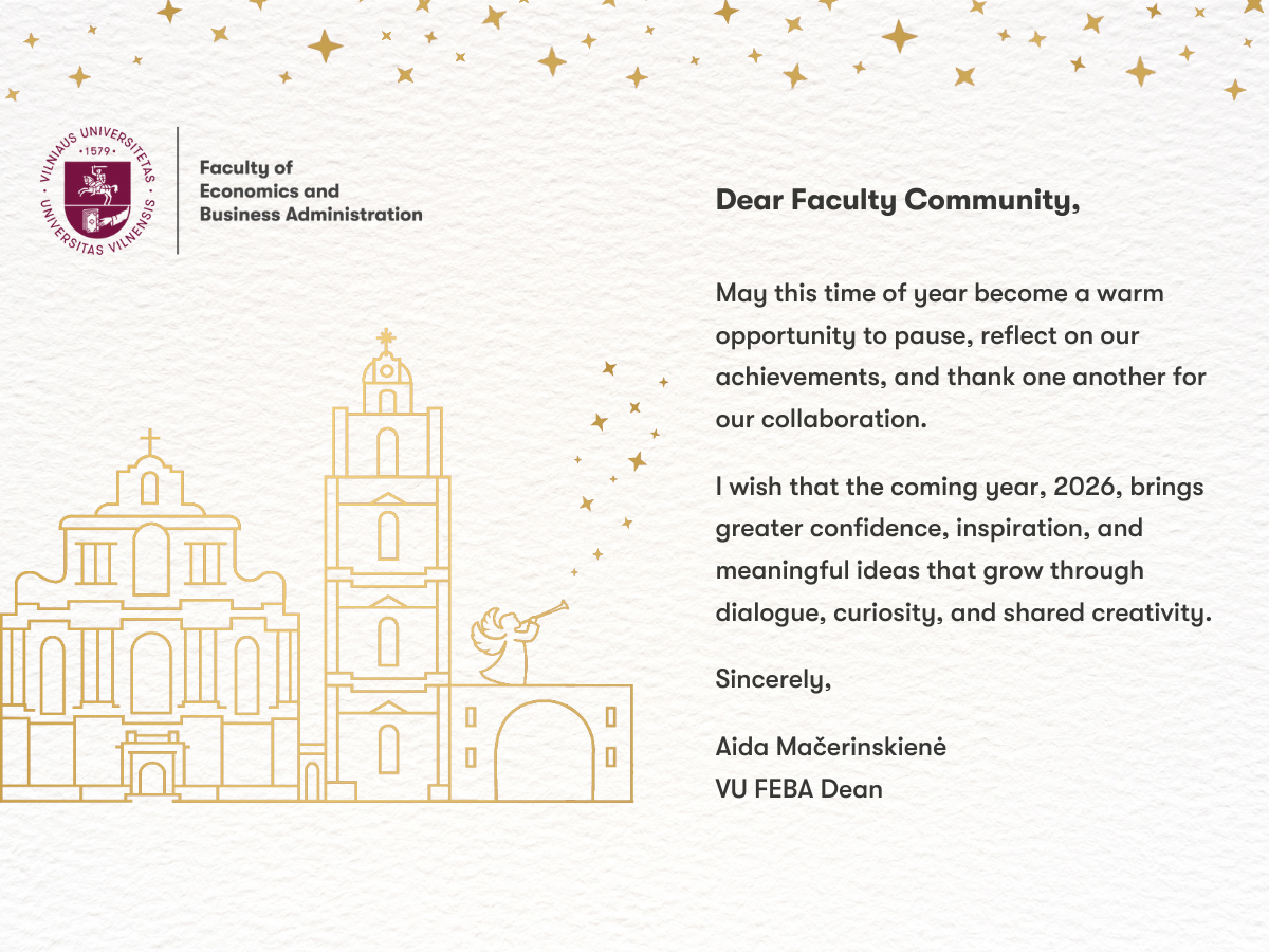 LT Miela fakulteto bendruomene, Tegul šis metų laikas tampa jaukia akimirka sustoti, pasidžiaugti nuveiktais darbais ir padėkoti vieni kitiems už bendradarbiavimą. Linkiu, kad ateinantys 2026-ieji atneštų daugiau pasitikėjimo, įkvėpimo ir prasmingų idėjų, kurios auga per dialogą, smalsumą ir bendrą kūrybą. Pagarbiai, Aida Mačerinskienė VU EVAF Read More